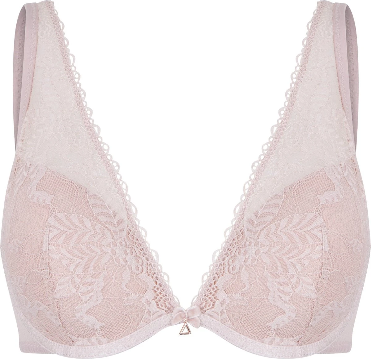 Dust… Zeg je fashion dan zeg je Dust! Deze fashionable serie is afgewerkt met een velvet strikje en een rosé kleurig hangertje. Deze geheel kanten triangle bh met beugel beschikt over padding in een mooie Dust kleur. De schouderbandjes zijn verstelbaar en afgewerkt met kant.